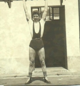 Decisi allora di costruirli in qualche modo. Trovai una barra con alle due estremità dei volani in ghisa che contenevano delle molle metalliche e che pesava kg.14.(era una vecchia sbarra di saracinesca dismessa ma per cominciare poteva andar bene. In seguito mi recai da un tale che aveva pesi per bilance e mi diede a poco prezzo due pesi da bilancia che aveva tra il ferro da smaltire. Costruii un manubrio da circa 4,5 k. Ma non era ancora completa la mia attrezzatura: Mi feci costruire da un falegname una panca in legno. Avevo tutto. Leggendo le istruzioni sul libro, iniziai ad allenarmi per due ed anche tre ora al giorno, pensando che più mi allenavo e più in fretta mi sarei irrobustito. Dopo alcuni allenamenti, il bilanciere di 14 kg. divenne leggero ed iniziai ad appesantirlo con dei dischi di pietra Leccese(quelli che al sud si usano per pavimentare le terrazze) .Ritornai dal “bilanciaio” , quello dei pesi per bilance e presi quattro pesi cilindrici da kg.5. Ormai mi allenavo con due manubri da dieci chili ed un “bilanciere”da 20 ed anche 30 kg. a seconda degli esercizi. Avevo stabilito tre allenamenti a settimana, anche perchè stavo iniziando la preparazione per le gare ciclistiche ed uscivo anche in bici (100-120km!)