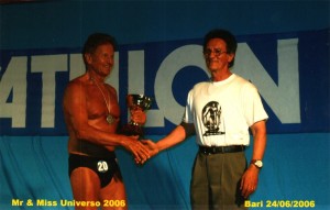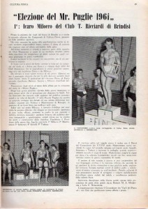L’evento che mi laureò con il titolo di Mister Puglia 1960 su un nutrito lotto di concorrenti fu la svolta decisiva per la mia carriera sportiva. Ero diventato un Culturista vincente, cinque anni dopo aver iniziato ad allenarmi con una vecchia saracineca e pesi di pietra!