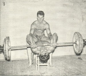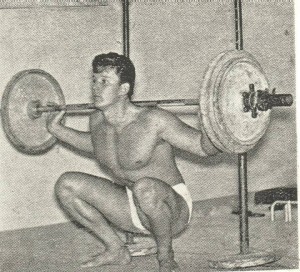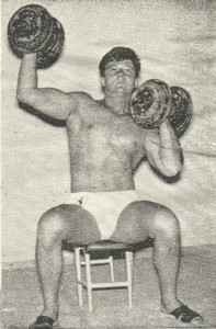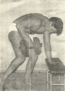 Decisi allora di costruirli in qualche modo. Trovai una barra con alle due estremità dei volani in ghisa che contenevano delle molle metalliche e che pesava kg.14.(era una vecchia sbarra di saracinesca dismessa ma per cominciare poteva andar bene. In seguito mi recai da un tale che aveva pesi per bilance e mi diede a poco prezzo due pesi da bilancia che aveva tra il ferro da smaltire. Costruii un manubrio da circa 4,5 k. Ma non era ancora completa la mia attrezzatura: Mi feci costruire da un falegname una panca in legno. Avevo tutto. Leggendo le istruzioni sul libro, iniziai ad allenarmi per due ed anche tre ora al giorno, pensando che più mi allenavo e più in fretta mi sarei irrobustito. Dopo alcuni allenamenti, il bilanciere di 14 kg. divenne leggero ed iniziai ad appesantirlo con dei dischi di pietra Leccese(quelli che al sud si usano per pavimentare le terrazze) .Ritornai dal “bilanciaio” , quello dei pesi per bilance e presi quattro pesi cilindrici da kg.5. Ormai mi allenavo con due manubri da dieci chili ed un “bilanciere”da 20 ed anche 30 kg. a seconda degli esercizi. Avevo stabilito tre allenamenti a settimana, anche perchè stavo iniziando la preparazione per le gare ciclistiche ed uscivo anche in bici (100-120km!)