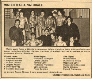 Iniziarono così a sorgere i primi concorsi di Mister muscoli: A milano partecipai al Mister Lombardia classificandomi secondo , poi, in seguito, la rivista Cultura Fisica indisse un concorso fotografico con votazioni dei lettori. Prima partecipai al mister nord Italia(quando ero a Milano),ancora secondo dietro a Claudio Mancini e l’anno dopo al Mister sud Italia (ero tornato a Brindisi) che finalmente mi vide vincitore.