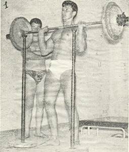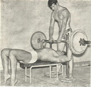 Riguardo agli esercizi base che eseguivo in Palestra a Milano, c’erano naturalmente la distensione in piedi con bilanciere, la distensione su panca con bilanciere,il rematore (rowing) con bilanciere, le trazioni alla sbarra che ormai eseguivo con aggiunta di peso allacciato con una catena alla vita e peso tra le gambe(20kg..)per sei-otto ripetizioni.Lo stacco da terra non mi ispirava molto, ma comunque lo facevo , anche se controvoglia. Ci sono esercizi che “senti” ed altri che non ti piacciono. Il sistema,come ho avuto occasione di dire in precedenza era di sei serie per tutti gli esercizi, riposo tra leserie di circa uno-due minuti caricando pesi e diminuendo le ripetizioni. A volte provavo anche i massimali per stabilire nuovi primati sulla tabella della FIdCF della rivista CULTURA FISICA di Firenze,organo federale. Un esercizio che mi “prese” e che ho poi sempre eseguito era il pull-over con bilanciere olimpionico (pesante) Sdraiato su panca, con la testa fuori dall’appoggio, quasi a guardare dietro. Tiravo il bilanciere da terra al petto, ripetendo il movimento.Avevo bisogno di un peso (un partner) seduto sulle gambe che mi teneva fermo sulla panca,poiché mi allenavo con 100 e passa kili e tendevo ad arcuarmi ed a ribaltare la panca (vedere foto)Mi allenavo sempre con un compagno e ci impegnavama sempre al massimo. Ricordo i nomi di due ottimi culturisti che si allenavano con me: Il compianto Gianni Massara,un calabrese milanese di adozione ed un romano Giorgio Castiglioni,che era anche giocatore di Hockey sul ghiaccio al Palasport milanese.