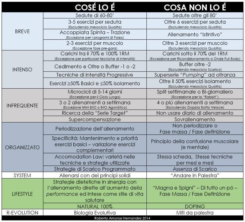 Ho dedicato alcuni articoli su Olympian’s riguardo a questo agomento, il piu completo é sicuramente “I Weak Point del BIIOSystem”el nº 146 di Maggio/Giugno 2014 ma gli approfondimenti arriveranno nei prossimi numeri del 2015 quando entreró in dettaglio programma per programma. Ci tengo a precisare che comunque non parleró piú di BIIO (anche se la filosofia sará fondamentalmente quella) per evitare far vivere di luce riflessa chi ormai non lo merita. La risposta é complessa e diciamo che parte dall’interpretazione della filosofía che sta alla base del Breve Intenso Infrequente ereditata da grandi personaggi come Kubik, McRobert, Mentzer, ecc, piuttosto che dalle proibizioni scaturite da un programma statico e codificato ormai piú di 13 anni fa. Il punto fondamentale é che sebbene le premesse originarie sono interessanti e produttive, é mancato fin da subito uno sviluppo che proporzionasse delle soluzioni hai problemi che apparivano con l’applicazione del sistema. Per questo molti atleti di spicco hanno dovuto fare “Modifiche” in corso d’opera che invece di essere studiate ed osservate per dei possibili miglioramenti, sono state fortemente criticate, al punto in cui oggi si sono tutti allontanati dalla “etichetta BIIO”… diciamo che “fare amici” non é stata una grande qualitá in questi anni. Io invece credo che essendo piú flessibili, questo tipo di approccio si possa avicinare alla maggior parte degli appassionati che non hanno molto tempo per allenarsi. Un punto di partenza sarebbe chiarire di cosa si parla ed a questo proposito credo che lo schema che ho disegnato per la rivista ON, possa aiutarci: