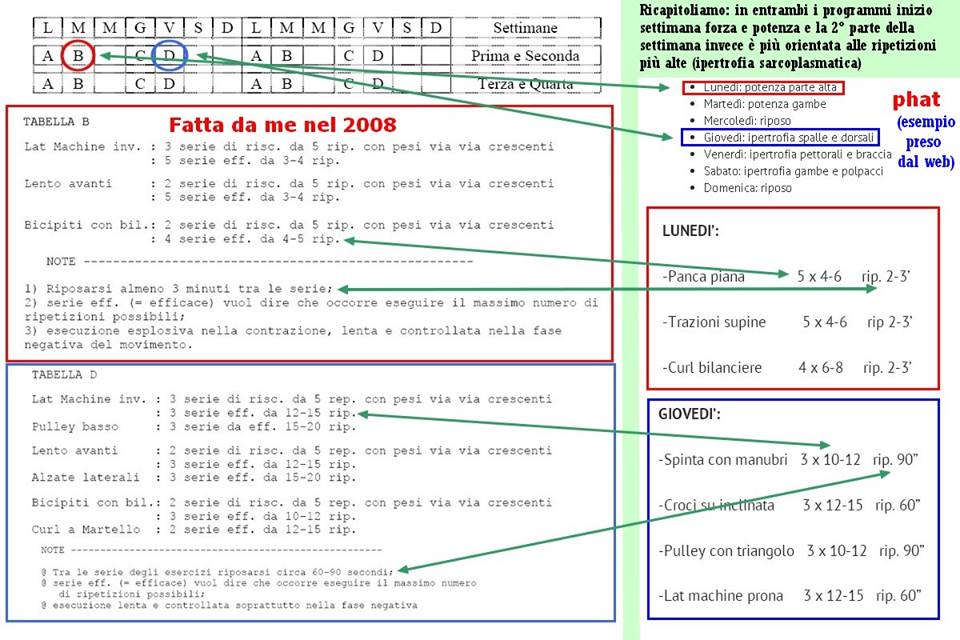 È bene sottolineare che il prof utilizzava tale metodo nel periodo in cui si allenava e quindi si parla di un periodo decisamente precedente al 2009; tuttavia la data esatta a questo punto diventa ininfluente perché a noi interessava dimostrare che l’idea di eseguire – nell’arco della settimana – alcuni allenamenti per la forza e altri per l’ipertrofia (NB: caratteristica peculiare del P.H.A.T.), sia antecedente al 2010-2011 e che quindi questo metodo presentato come “innovativo e moderno”, non ha nulla di originale nella sua struttura … e semmai di “moderno”, ha solo il nome!! Solitamente, prima del 2010-2011 lo chiamavamo in maniera classica (o se volete “old”) a volte “Forza-Pompaggio” e a volte “Forza-Ipertrofia” … ma si sa, i termini in italiano non attirano clienti e non generano “inventori” …